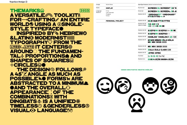 פרויקט לא מסחרי, דה מארקס הוא גופן סן סריפי הכולל אמוטיקונים כחלק ממפת התווים שלו, בגרסה מעוגלת ובגרסה מרובעת.