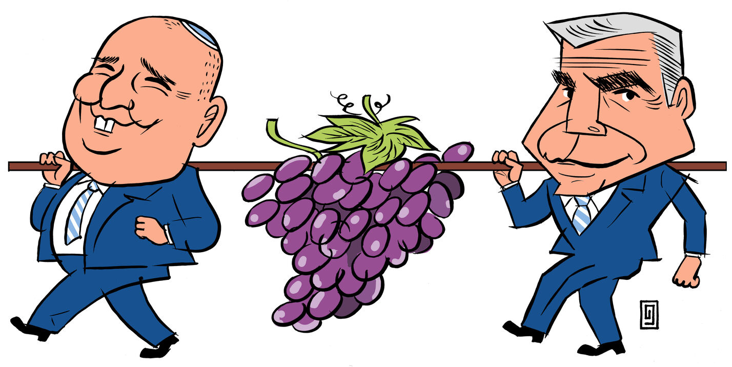 נפתלי בנט ויאיר לפיד אוחזים יחדיו באשכול ענבים, כאזכור לסמל של משרד התיירות.